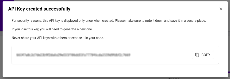 Keep in mind that the API key is only displayed when created. If you lose access to this key, you’ll need to generate a new one.